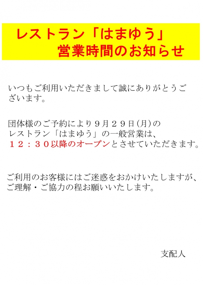 いつもサンライズ九十九里をご利用いただきまして誠にありがとうございます。 団体様のご予約により 令和7年9月29日(月)のレストラン「はまゆう」の 一般ランチ営業は12:30以降とさせていただきます。 ランチ営業時間変更:令和7年9月29日(月)12:30以降~ ご利用のお客様にはご迷惑をおかけいたしますが、ご理解・ご協力の程お願い申し上げます。