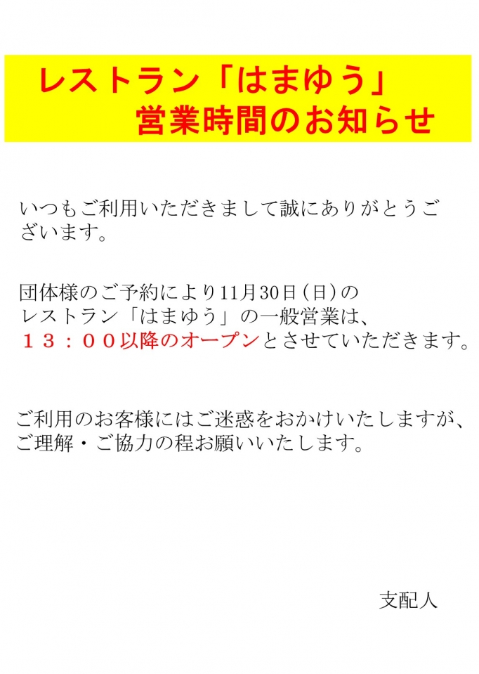 いつもサンライズ九十九里をご利用いただきまして誠にありがとうございます。 団体様のご予約により 令和7年11月30日(日)のレストラン「はまゆう」の 一般ランチ営業は13:00以降とさせていただきます。 ランチ営業時間変更:令和7年11月30日(日)13:00以降~ ご利用のお客様にはご迷惑をおかけいたしますが、ご理解・ご協力の程お願い申し上げます。